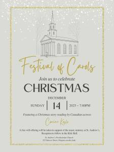 Save the date for St. Andrew’s Festival of Carols on Sunday, December 14th at 7:00 p.m. St. Andrew’s would like to welcome back Corrine Koslo, Veteran Shaw Festival Actor and ‘Rachel’ in TV’s Anne with an E, as special guest storyteller! .